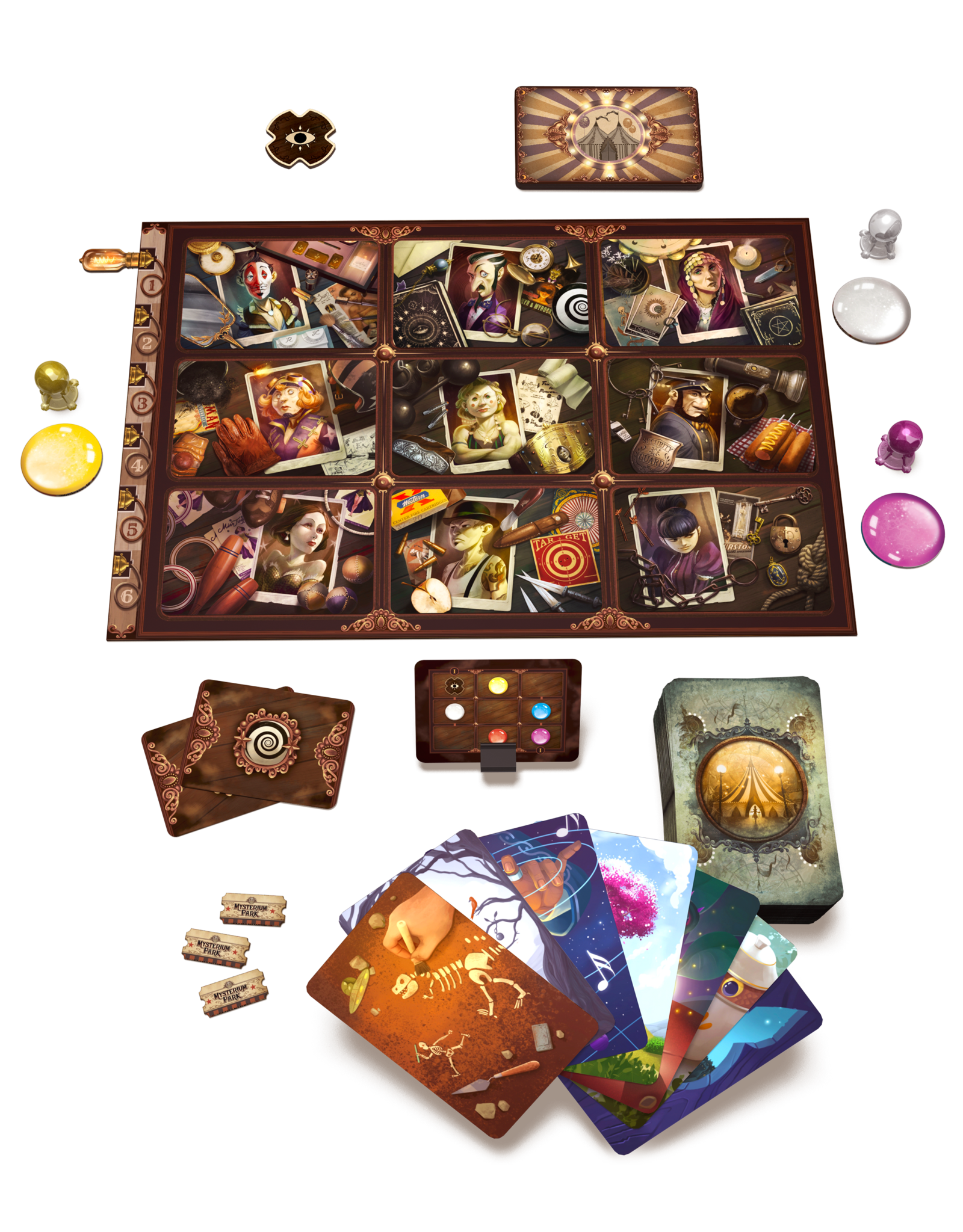 Set in the lights of a 1950's US fairground, Mysterium Park shares the same core mechanism with the famous award-winning game it reimplements, though bringing a different approach: it is smaller and faster, thanks to very quick setup and simplified rules.