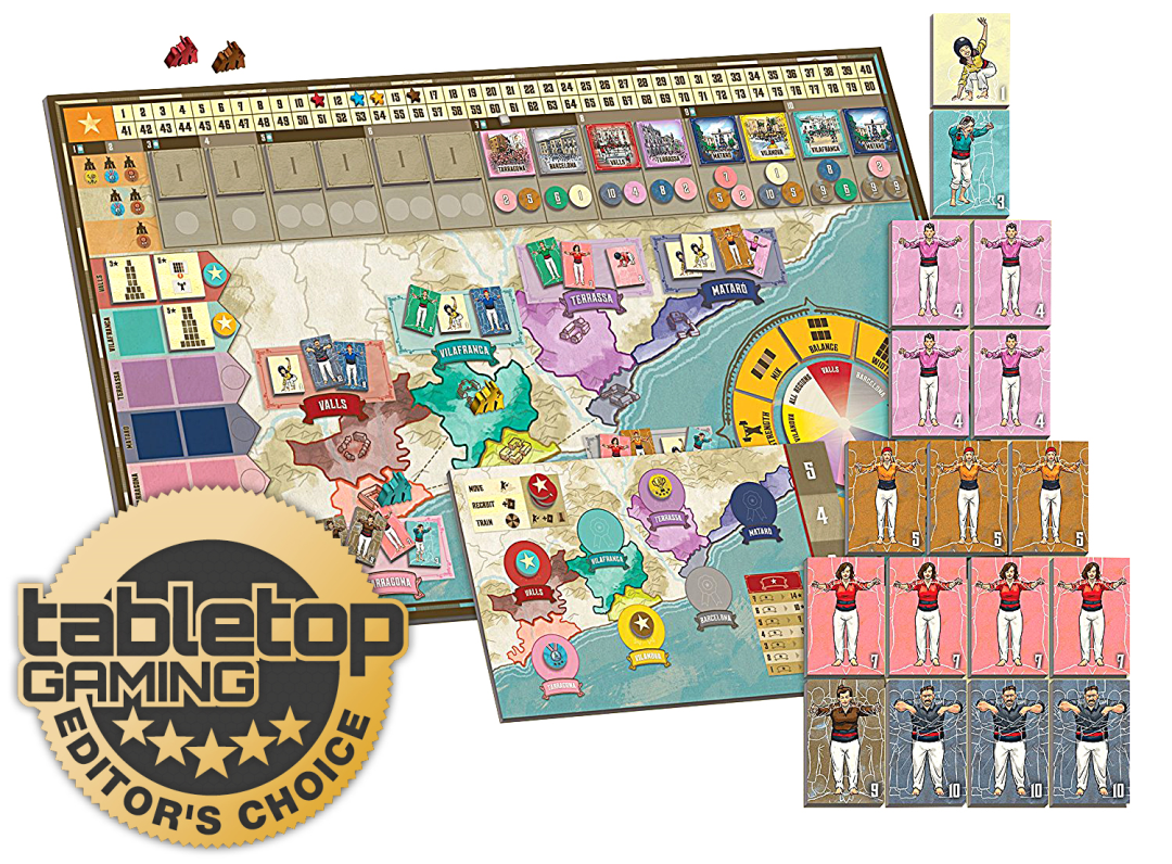 Castell is a rich folk tradition in Catalonia, for which people gather at festivals to build human towers up to 8-10 people high! In the game, you run a castell team and are traveling around the various regions of Catalonia, recruiting castellers to your team, training new skills to build more impressive towers, and performing at festivals in the Catalan villages and towns. Do you have what it takes to be the best colla, or castell team, in the land?