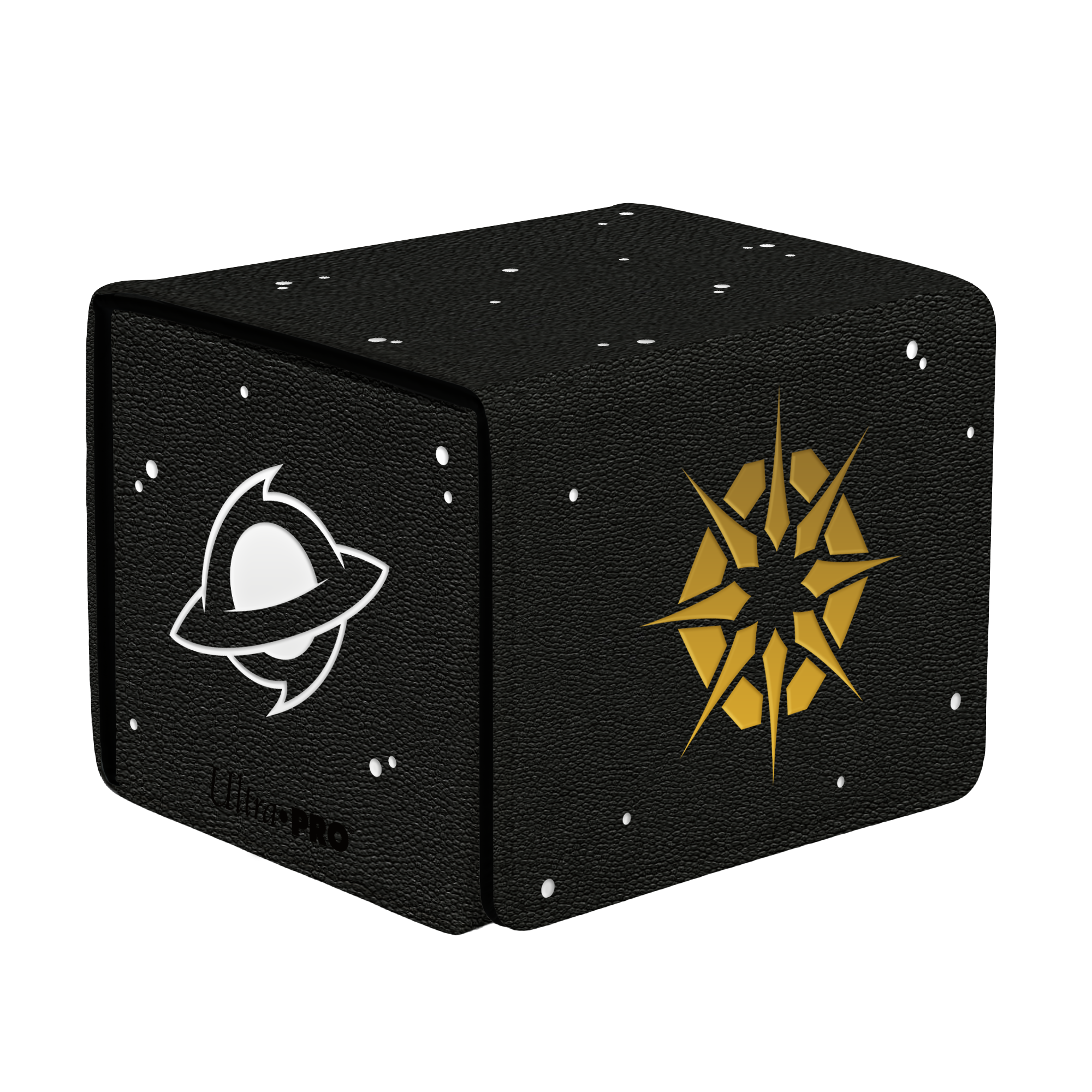 The Alcove Edge Deck Box for Magic: The Gathering features the iconic set symbol debossed onto a leatherette finish, and has dual thumb notches for easy open access to your deck. Store and protect up to 100 standard size trading cards double-sleeved in Ultra PRO Deck Protector® sleeves. The interior features a stylized pattern. Strong magnetic closure with a locking mechanism keeps your cards securely stored when not in use.