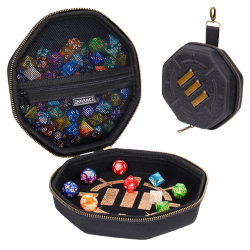 Equipped with heavy duty zippers, scratch-resistant lining, and a large soft-lined dice rolling tray with large wall. The ENHANCE Dice Storage Case is the perfect addition to your collection of RPG travel accessories. It is actually two products in one, with one half safely storing up to 150 dice and the other functioning as a large dice tray that can be passed around the gaming table. A hard shell reinforced case protects your dice from wear and tear, while the soft lined interior keeps all your dice free from blemishes and unsightly scratches. It also features a metal attachment clip for attaching to backpacks and bags. Our Dice Travel Case is great for Dungeons and Dragons, board games, and various other tabletop RPG games. Replace your small dnd dice bags and bulky dice trays with the ENHANCE Dice Case, a solution for all RPG players.