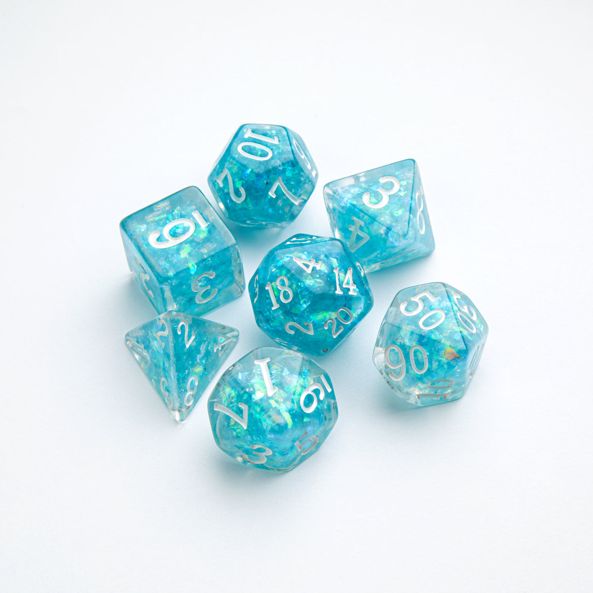 Choose your weapon! This dice set contains a D4, a D6, a D8, two D10 (10 and 00), a D12 and a D20. All dice are round-cornered and manufactured at a premium level. The Candy dice are infused with beautiful glitter flakes. They are packed in a window cardboard box that displays all dice at the front.