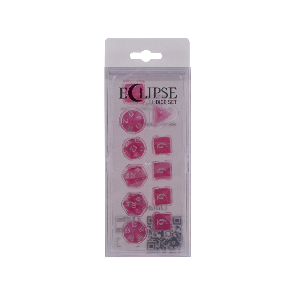The Eclipse Pacific Blue 11 Dice Set is a gamer's best friend! While most RPG dice sets include only the polyhedral 7, Ultra PRO is here to help you UP your game with additional dice needed for modern RPG games. Each set includes D4, 4x D6, D8, 2x D10, D12, and 2x D20. The dice come in a 2-piece acrylic storage box with enough space for up to 40 dice and are sized to fit pens, markers, or other small RPG accessories. Eclipse Dice feature a shimmering finish that makes every roll magical! Aligned with the 12 Eclipse colors, these dice are the perfect companion for the 100+ Deck Boxes, Matte or Gloss sleeves, and PRO-Binders.