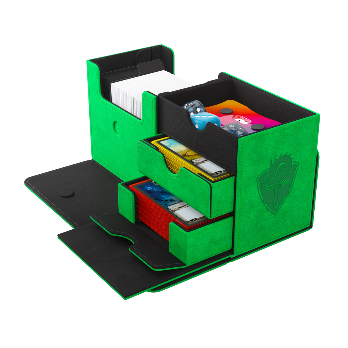 - Top section for additional accessories, cards, tokens, dice, Life Counter, Toploaders, or Slide Card Cases