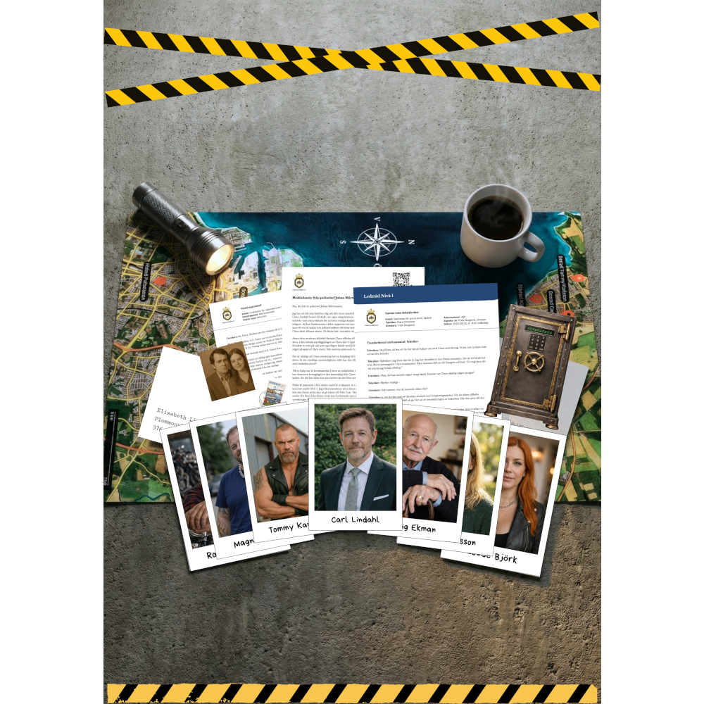 Innehåller: Karta, bevismaterial från brottsplats, förhörsprotokoll, obduktionsrapport, gåtor på varje nivå, ledtrådar, foton och mycket mer.