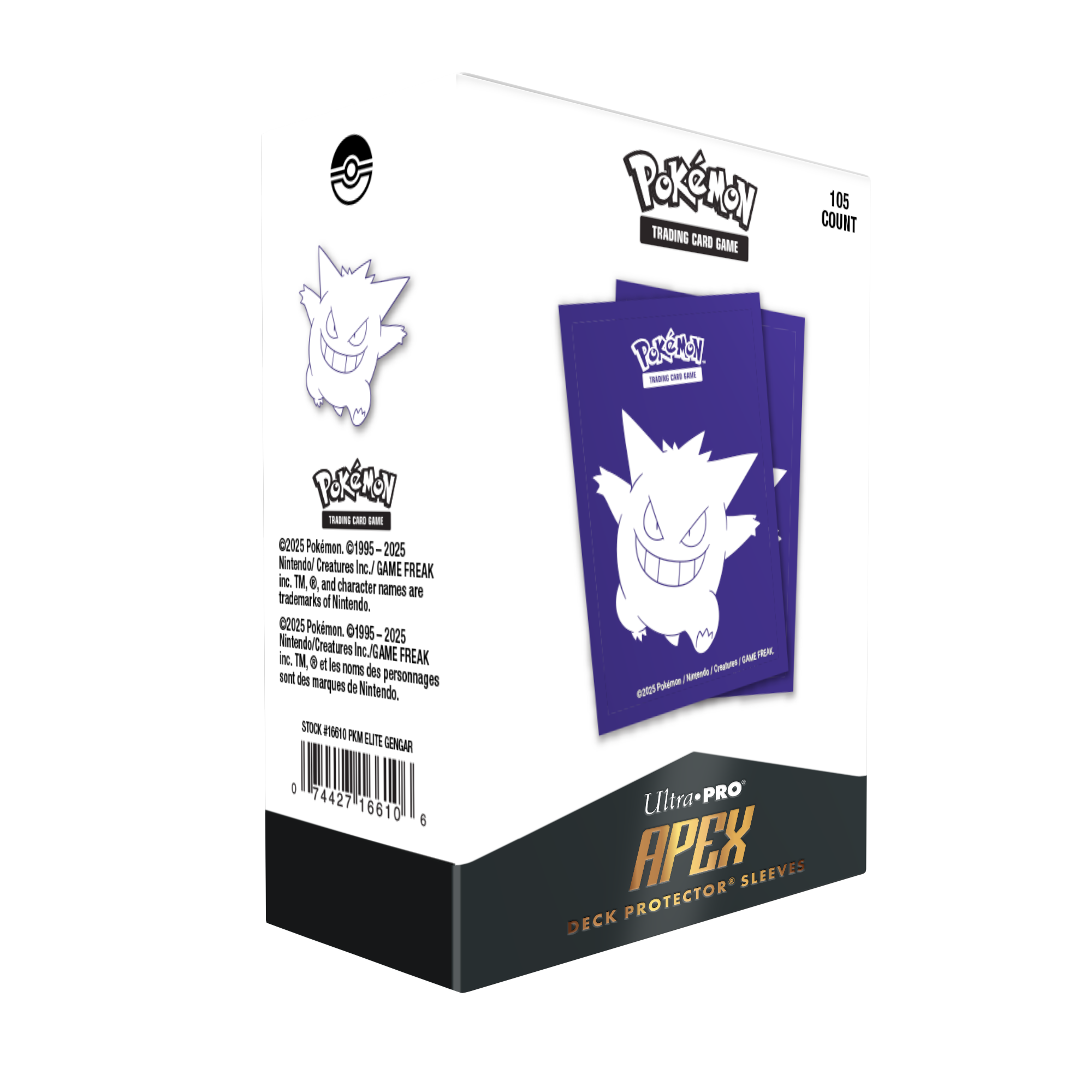 The 105ct APEX DECK PROTECTOR® Sleeves for Pokémon TCG are made with our new easy-shuffle formulation and feature vibrant Gengar artwork on a textured back. Archival-safe polypropylene materials ensure you can sleeve your cards with confidence, and the gloss clear front allows your foil cards to shine! Sized for standard size trading cards measuring 2.5 in. x 3.5 in.