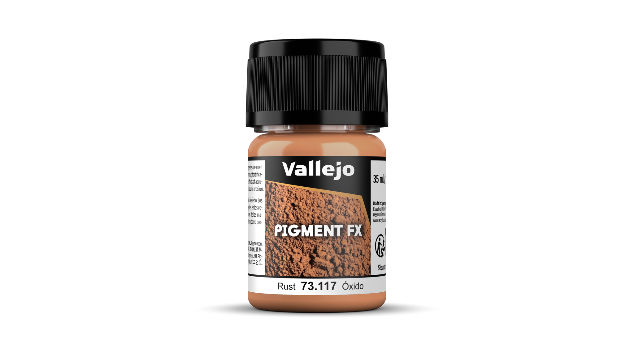 The Pigment FX, a selection of natural earth and synthetic pigments, have been chosen for their permanence, their excellent light fastness, and for the extra fine milling of their particles, which facilitates the mixtures and their application on models and dioramas. The range of pigments includes a series of colors selected for representing the wear and erosion caused by the conditions of hard use and exposure on vehicles and buildings, to reproduce the dust caked on the tracks of the tanks, the rust on the armour and the wide range of effects caused by the climate and geographic conditions of deployment. Pigments can be applied in their dry form, directly by brush on the model, since they have excellent adherence; they can also be fixed in place with Thinner when used to portray dry mud or accumulated dust. With Pigment Binder, the pigments can be used to create volumes, such as accumulated dirt and mud. Painting tools are cleaned with water.