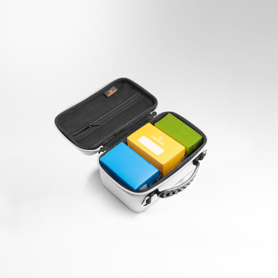 The Game Shell is a portable case, perfectly sized for a wide variety of usages. It fits up to 250 double-sleeved cards, tokens, dice or even complete small games. The outside material comes in durable and resistant nylon with a premium structure. It boasts a reinforced handle and two zippers, hidden and protected by the outer material. On the inside, the Game Shell provides an accessories compartment and 2 adjustable dividers. This enables a completely free setup, adjustable to your needs and preferences.