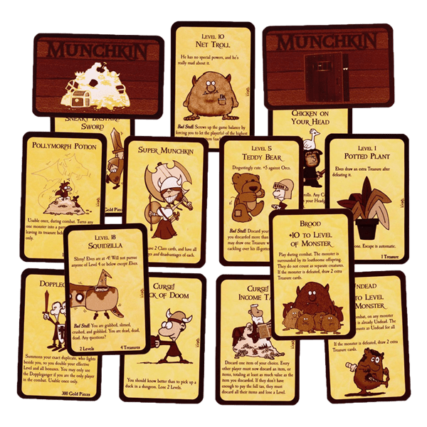 This award-winning card game, designed by Steve Jackson, captures the essence of the dungeon experience... with none of that stupid roleplaying stuff. You and your friends compete to kill monsters and grab magic items. And what magic items! Don the Horny Helmet and the Boots of Butt-Kicking. Wield the Staff of Napalm... or maybe the Chainsaw of Bloody Dismemberment. Start by slaughtering the Potted Plant and the Drooling Slime, and work your way up to the Plutonium Dragon...
