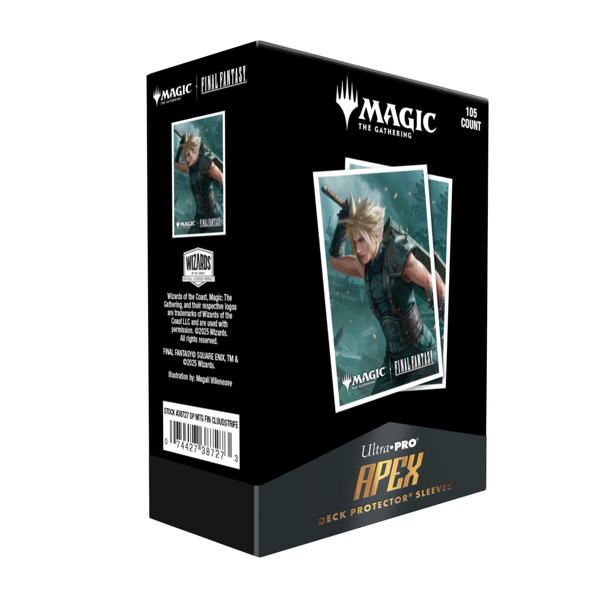 The Magic: The Gathering®—FINAL FANTASY™ Cloud, Planet's Champion 105ct APEX Deck Protector™ Sleeves are made with our new easy-shuffle formulation and feature vibrant artwork on a textured back. Archival-safe polypropylene materials ensure you can sleeve your cards with confidence, and the gloss clear front allows your foil cards to shine! Sized for standard size trading cards measuring 2.5 in. x 3.5 in.